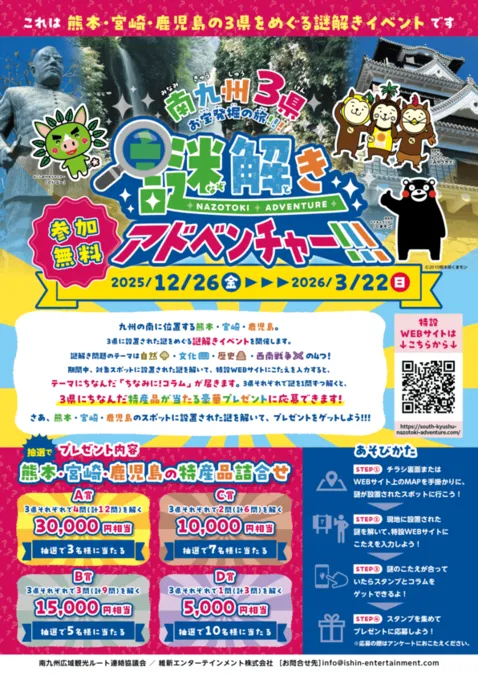 【周遊型謎解きゲーム『南九州3県お宝発掘の旅!!!謎解きアドベンチャー!!!』とは】熊本県、宮崎県、鹿児島県の3県をめぐる周遊型謎解きイベントです。達成度によって、南九州3県の特産品が当たる抽選チャンスに複数回応募できる […]